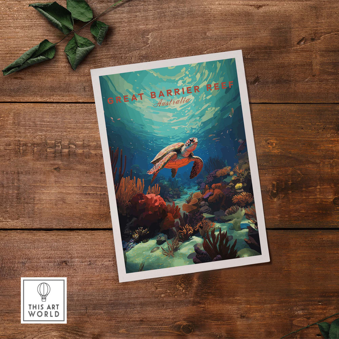 Faites une déclaration dans votre maison ou votre bureau avec cette superbe affiche vibrante de la Grande Barrière de Corail, mettant en vedette une majestueuse tortue de mer. Parfait pour créer un mur de galerie ou inspirer une envie de voyager ! Ajoutez une touche d’Australie à n’importe quel espace.