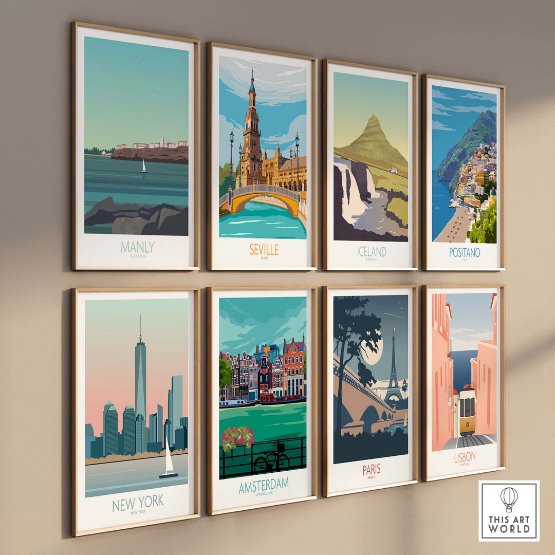 Collection of vintage travel posters featuring Manly, Seville, Iceland, and more, styled for home decor.