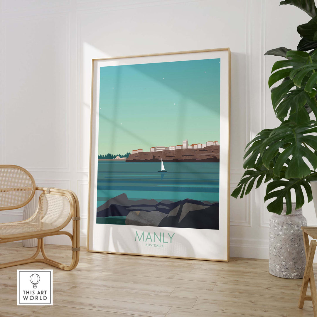 Manly Wall Art Australia Travel Poster displayed in a stylish home setting with wooden decor.