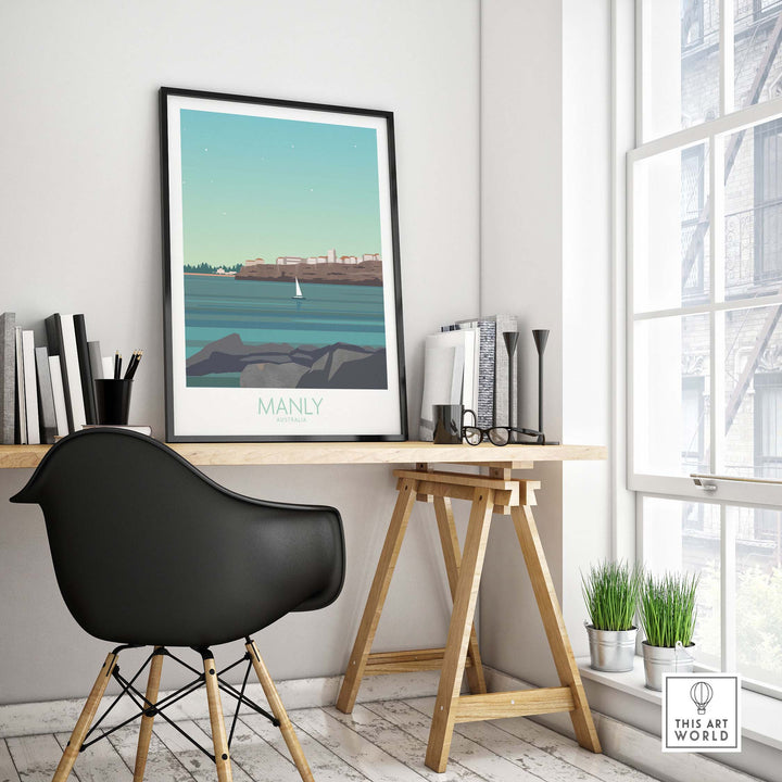 Stylish Manly Wall Art Australia Travel Poster displayed in a modern home office setting.
