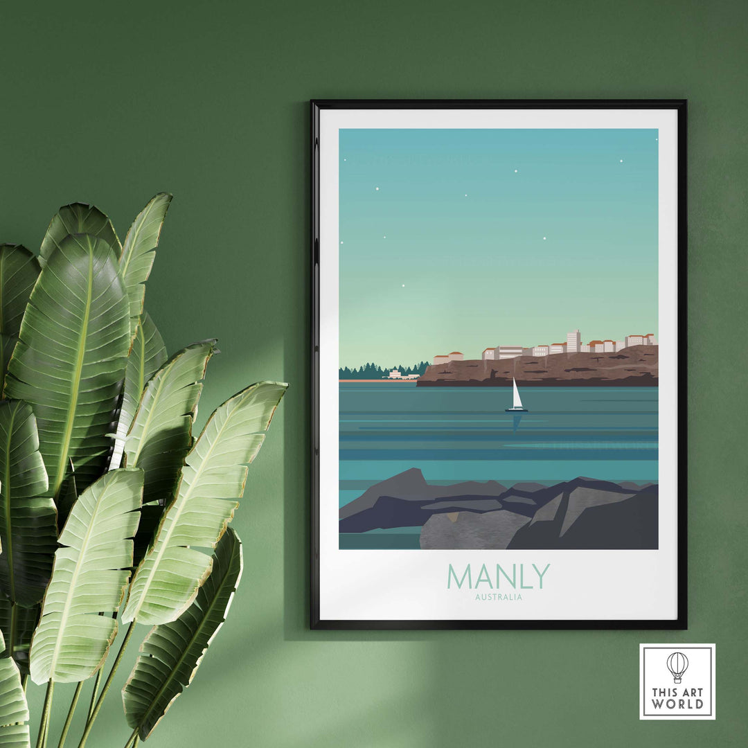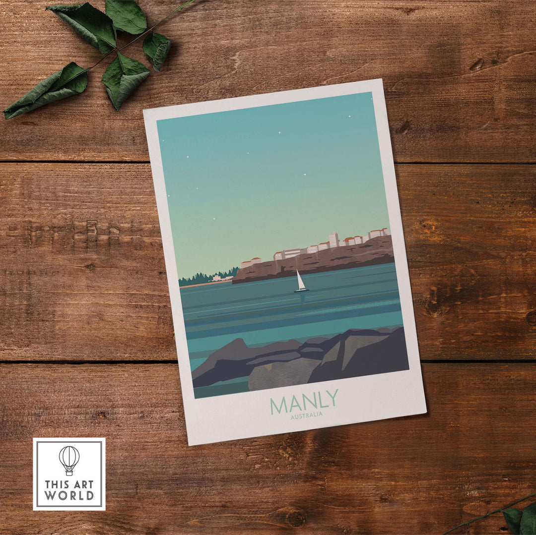 Manly Wall Art Australia Travel Poster featuring serene coastal view and sailboat, perfect for home decor.