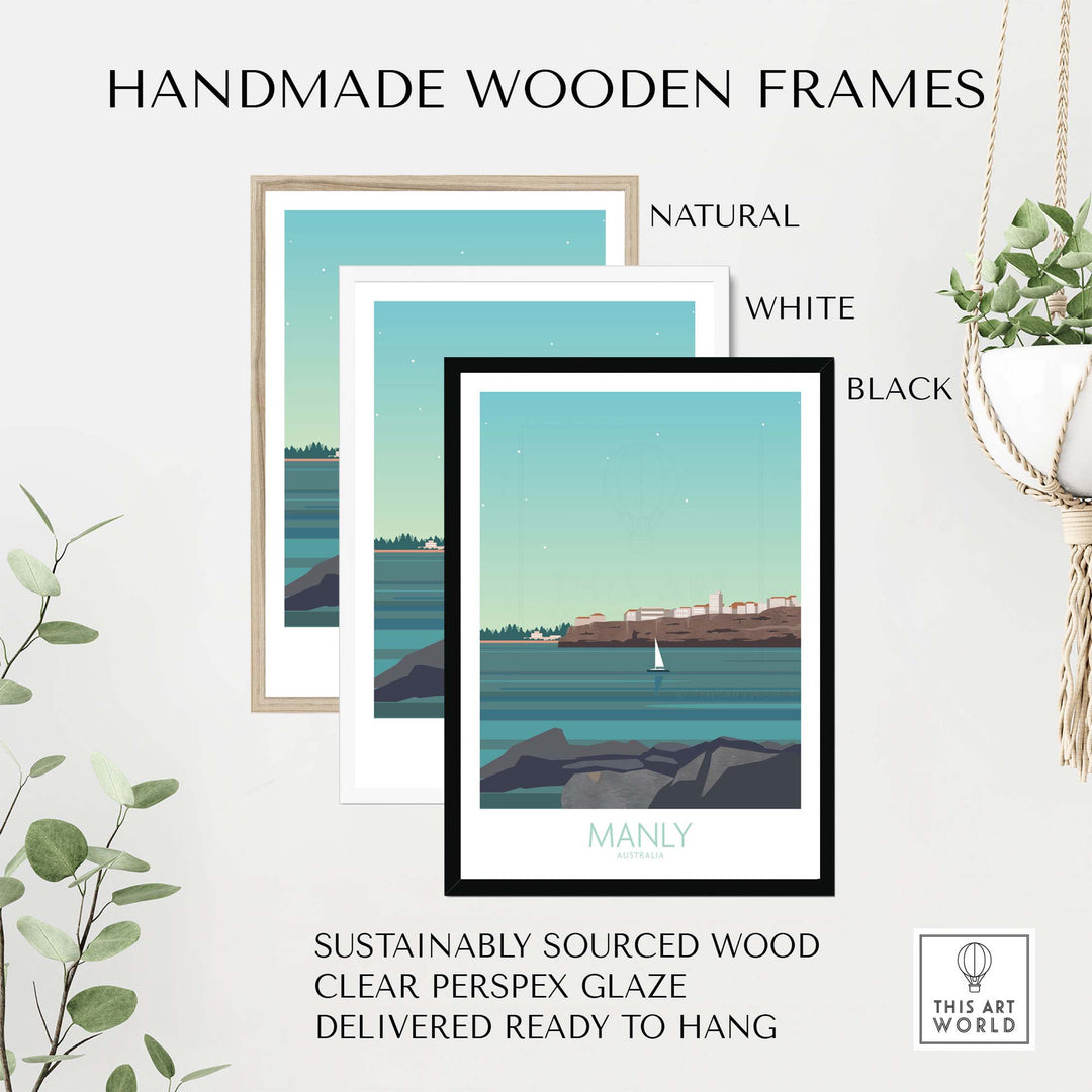 Handmade wooden frames for Manly Wall Art Australia poster in natural, white, and black options.