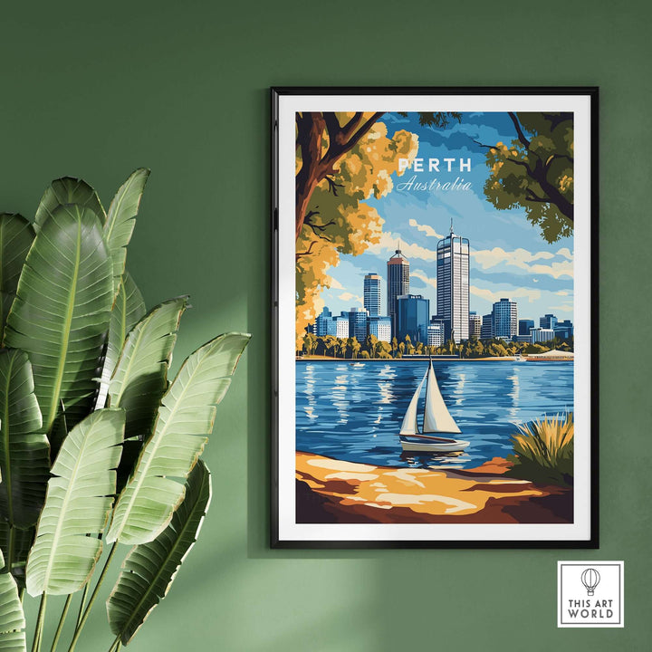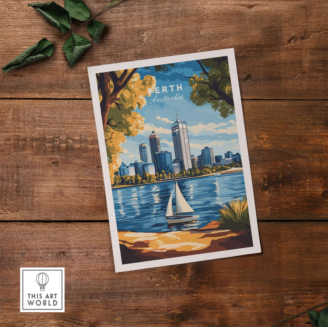 Perth travel print showcasing city skyline and serene river with sailboat, perfect for home decor and travel inspiration.
