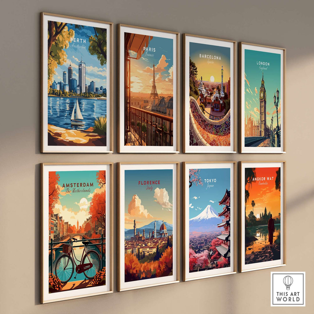 Collection of travel prints featuring iconic cities including Perth, Paris, Barcelona, and more, perfect for home decor.