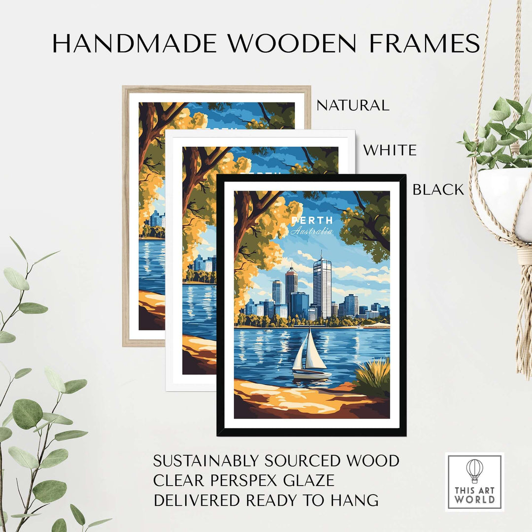Handmade wooden frames in natural, white, and black finishes for Perth travel print art.
