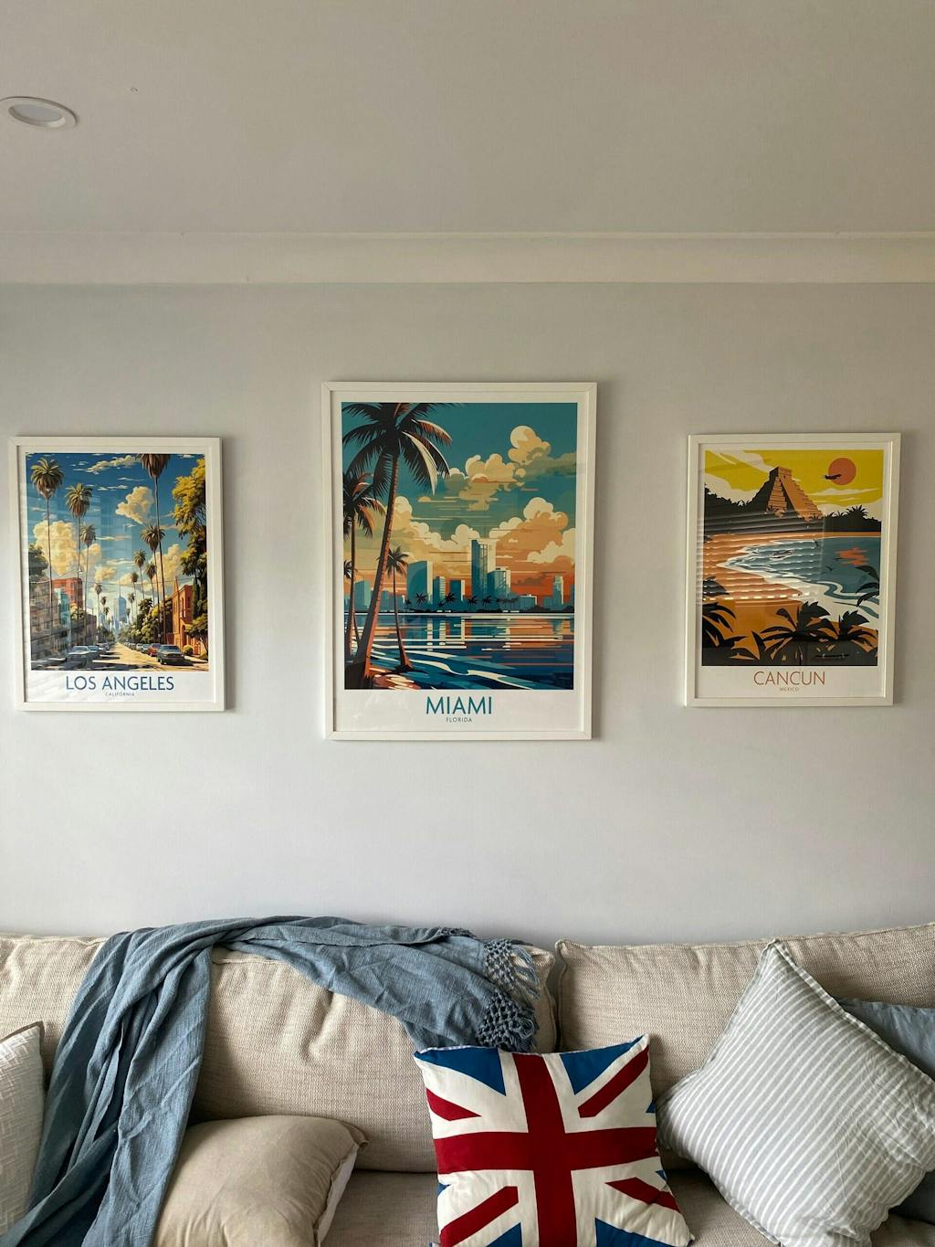 Cancun travel poster print displayed on a wall, surrounded by stylish decor in a cozy living space.