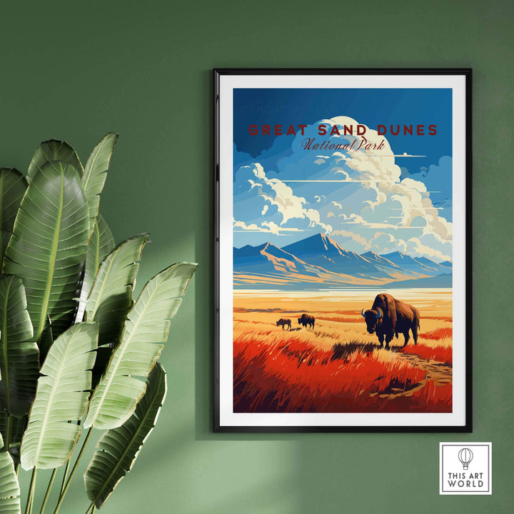 Apportez la beauté des Rocheuses du Colorado à vos murs avec cette superbe affiche du parc national et réserve des Great Sand Dunes ! Avec ses couleurs vibrantes et sa représentation détaillée du parc mettant en vedette des bisons, cette pièce captivera et inspirera vos invités. Alors qu'est-ce que tu attends? Obtenez votre affiche aujourd'hui !