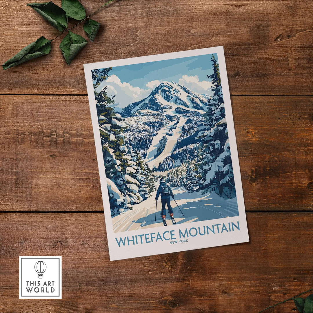 Whiteface New York print featuring a skier on a snowy mountain with trees, perfect skiing scene wall art.