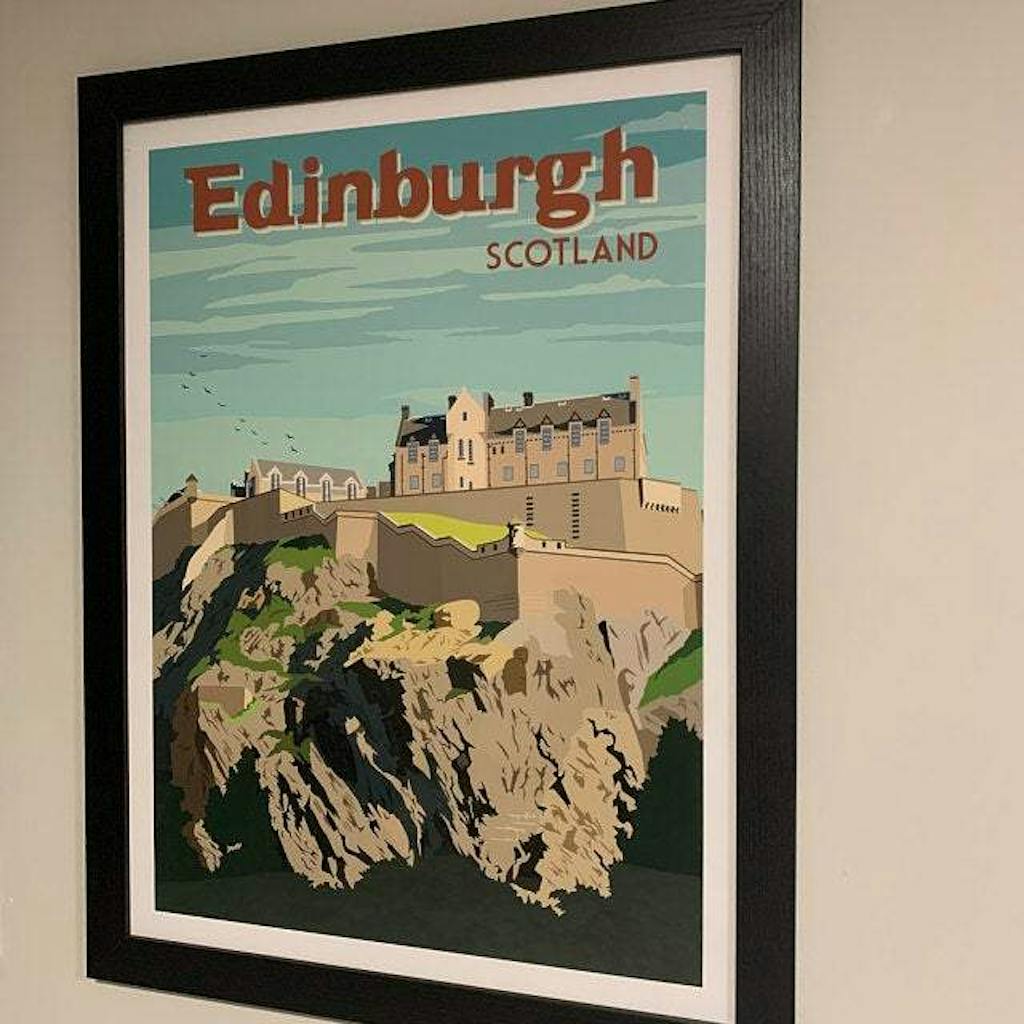 Edinburgh vintage travel poster on wall, showcasing Edinburgh Castle, perfect for home and office decor.