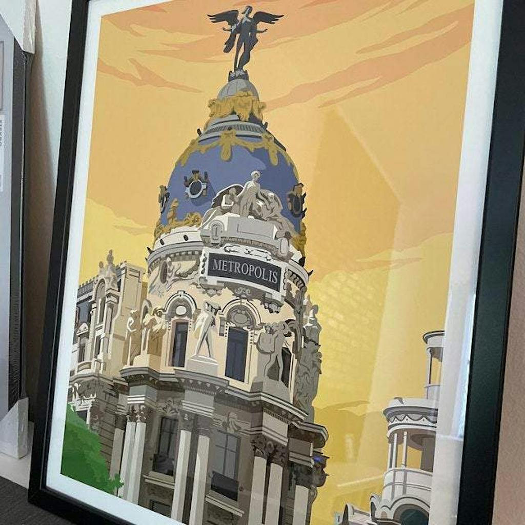 Vintage Madrid poster wall art featuring Metropolis building with a vibrant sunset backdrop.